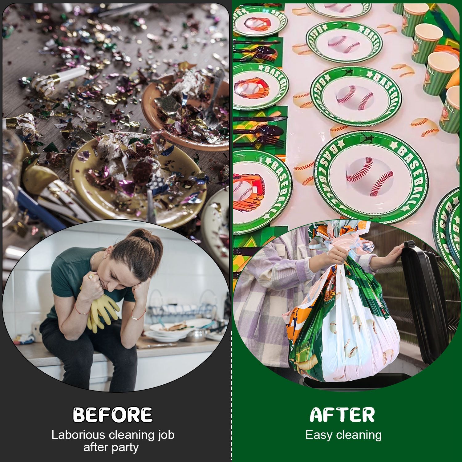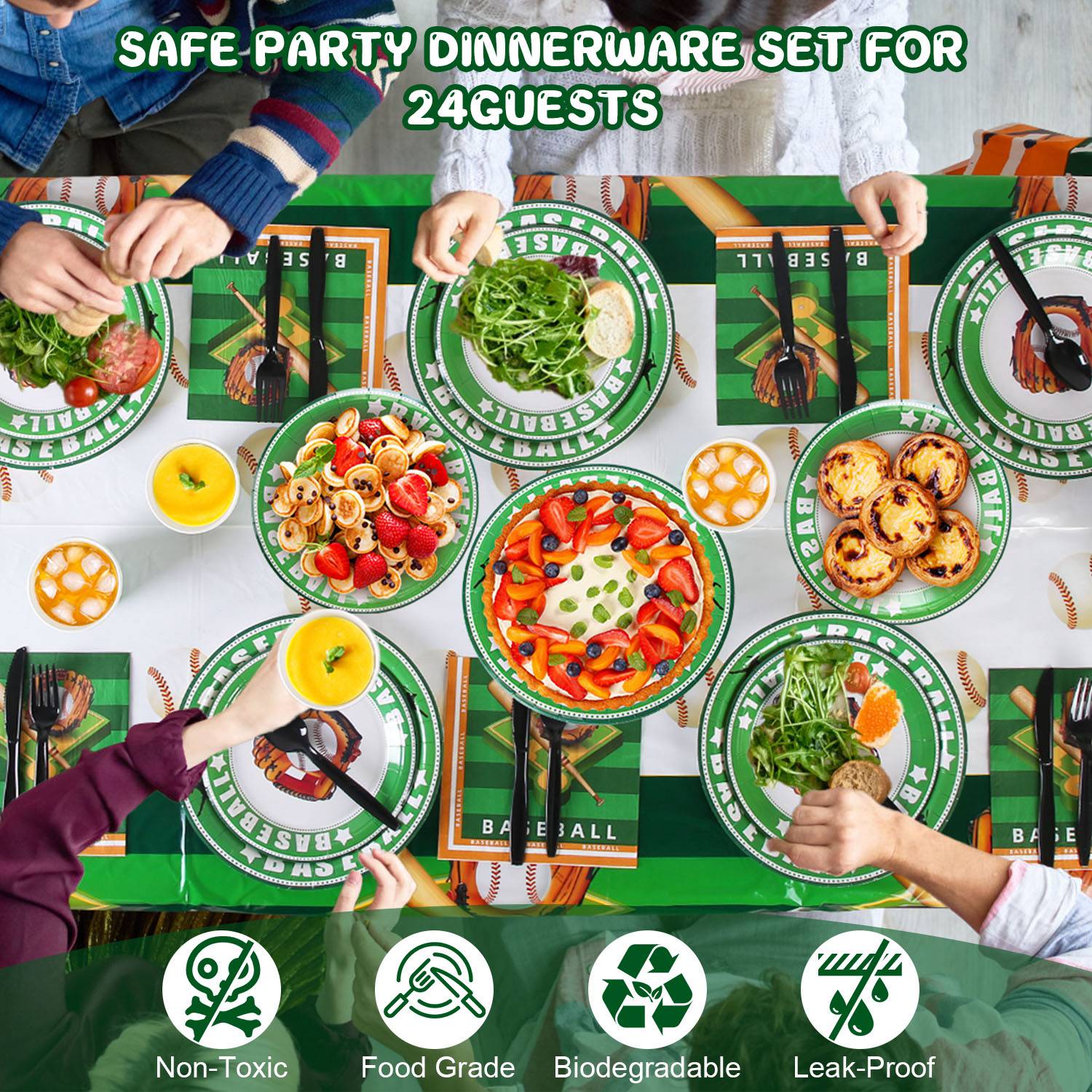 - *Time-Saving Disposable Dinnerware*: Cleaning up after a delightful party has always been a source of frustration. However,with our disposable baseball themed tableware set,you can save time and effort to enjoy precious moments with your family and friends. Simply throw away these recyclable baseball party dinnerware,won’t cause any environment burden.