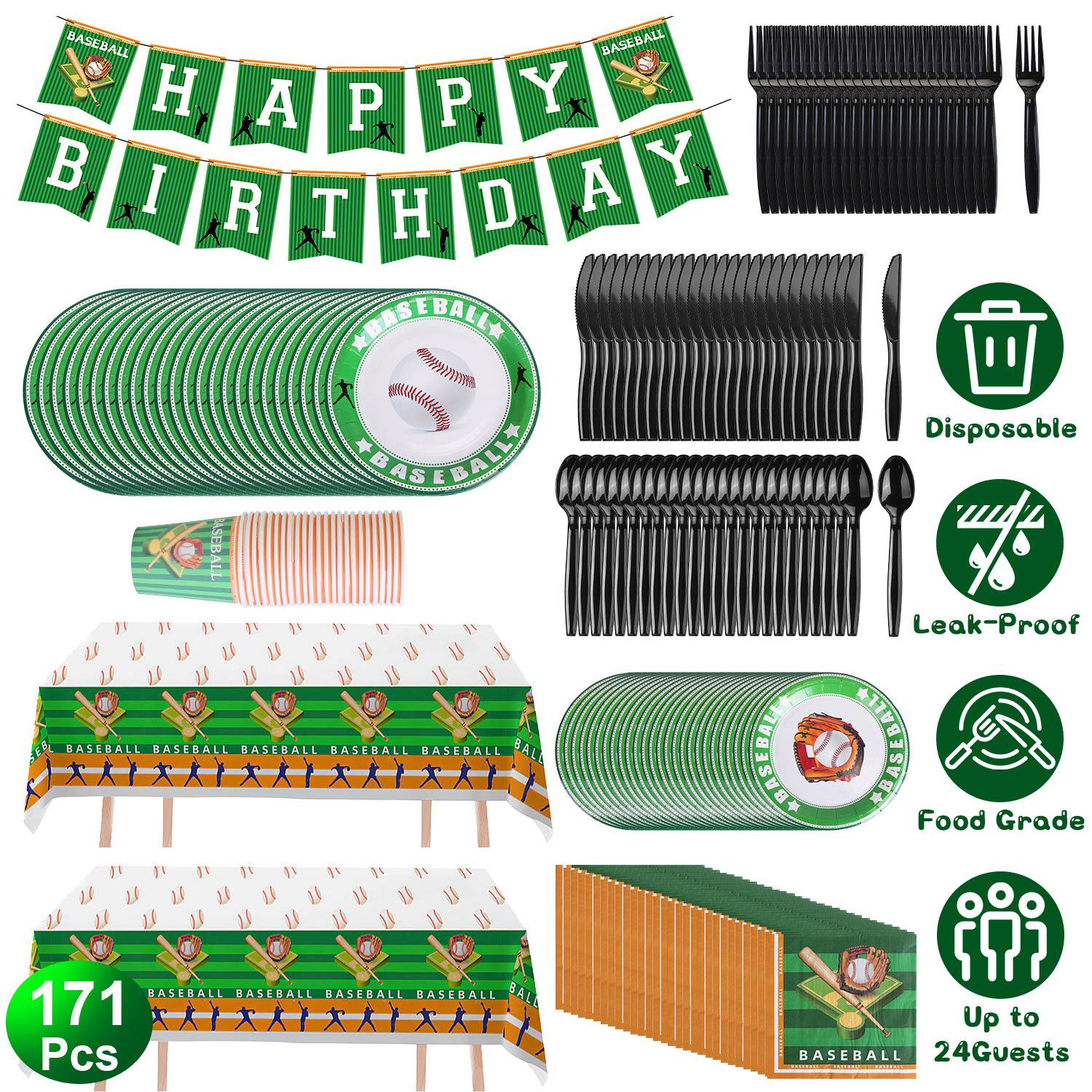 - *Complete Baseball Party Supplies for 24 Guests*: Our baseball party supplies include complete essentials:24Pcs cups to contain drinks and juice;24Pcs forks,spoons,knives,dessert plates,dinner plates for eating and cutting salad,vegetables and meats;24Pcs napkins to wipe hands and mouths when finishing meal;2Pcs tablecloths and 1pack of birthday flags for decorating. 171Pcs baseball party dinnerware set is enough for serving up to 24 guests at one time.