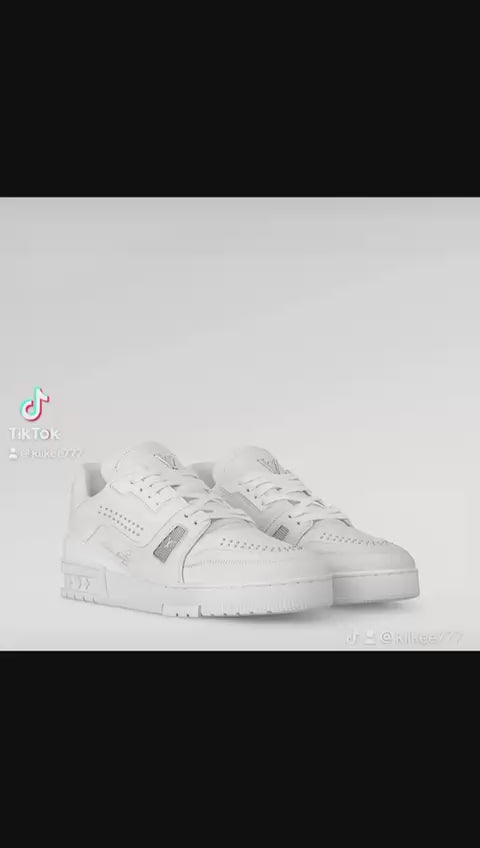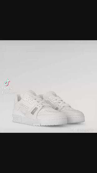 "El icónico sneaker LV Trainer se reinventa en piel de becerro granulada con detalles en metal tono plateado, incluyendo pequeños tachones y las iniciales LV. Diseñado originalmente por Virgil Abloh, este modelo se inspiró en las zapatillas de baloncesto vintage. Lleva la firma tipográfica de Louis Vuitton en el lateral, mientras que la suela técnica de goma está decorada con Flores del Monograma."