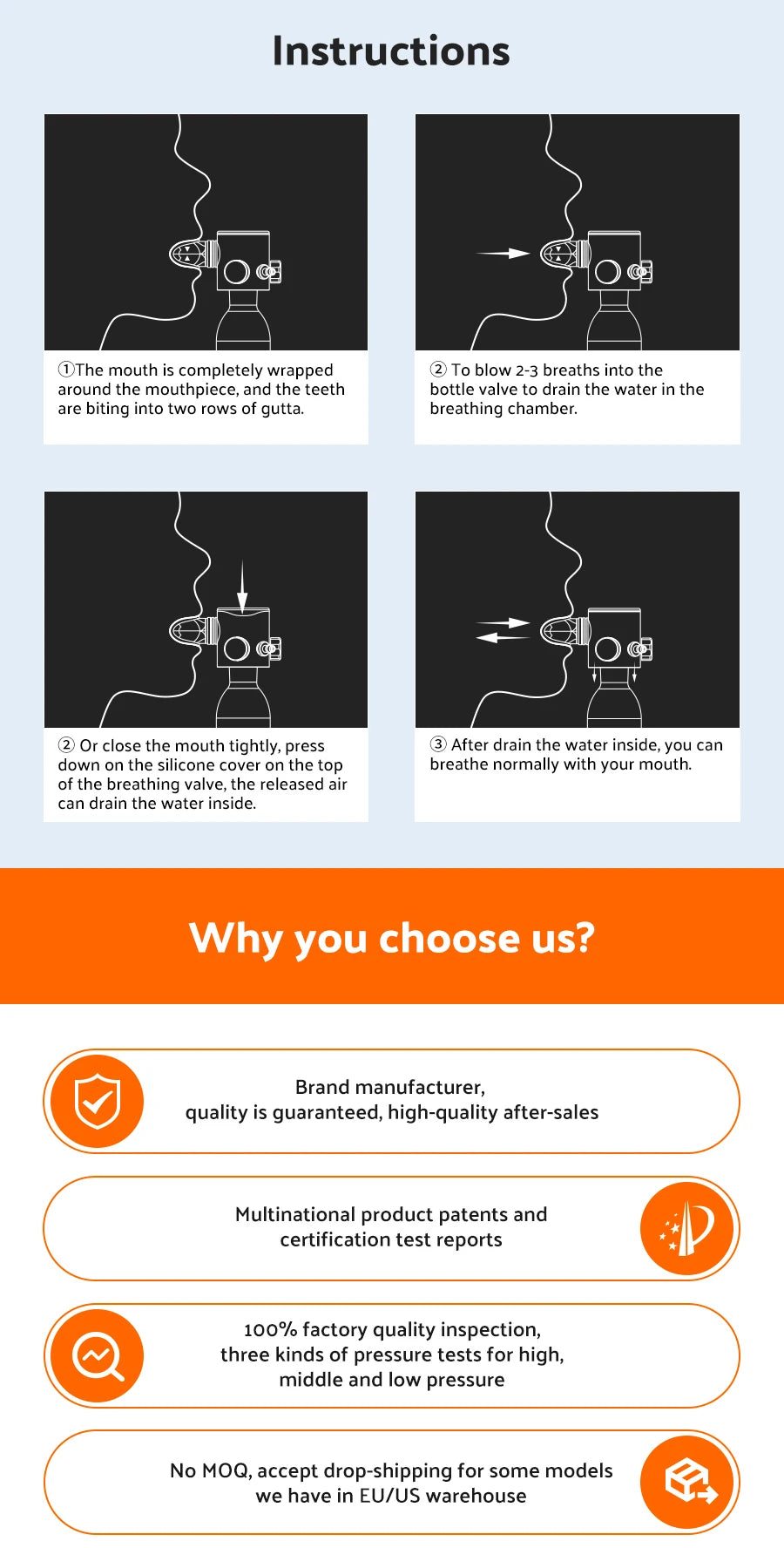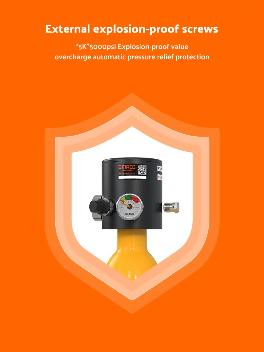 【Three Ways to Inflate】The scuba cylinder inflation interface is 8mm and the working pressure is 3000Psi/200Bar/20Mpa. There are three ways to inflate.The first method is to use a re。fill adapter that contacts the large bottle to guide the small bottle. (usually in dive shops).The second method is that you can use an electric compressor, the 0.5 liter bottle takes 10 minutes to be completely filled.The third method is to use a hand pump.We recommend using it as a backup device.