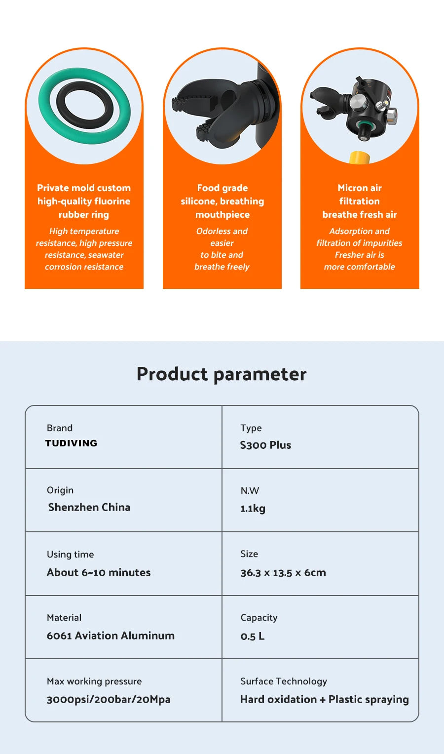 【Portable Design】: TUDIVING 0.5L diving tank provides 5-10 minutes of air,dive times vary, depending on your breathing rate and dive depth. The perfect size of the bottle with a diameter of 6CM is very suitable for carrying around. After the diving tank is disassembled, you can take it on the plane and go diving anywhere.